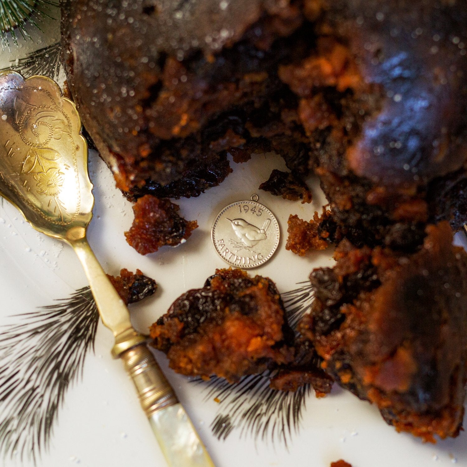Tradition says a sixpence should go in but we like the farthing better, and it's always fun to see which spoon it turns up in.