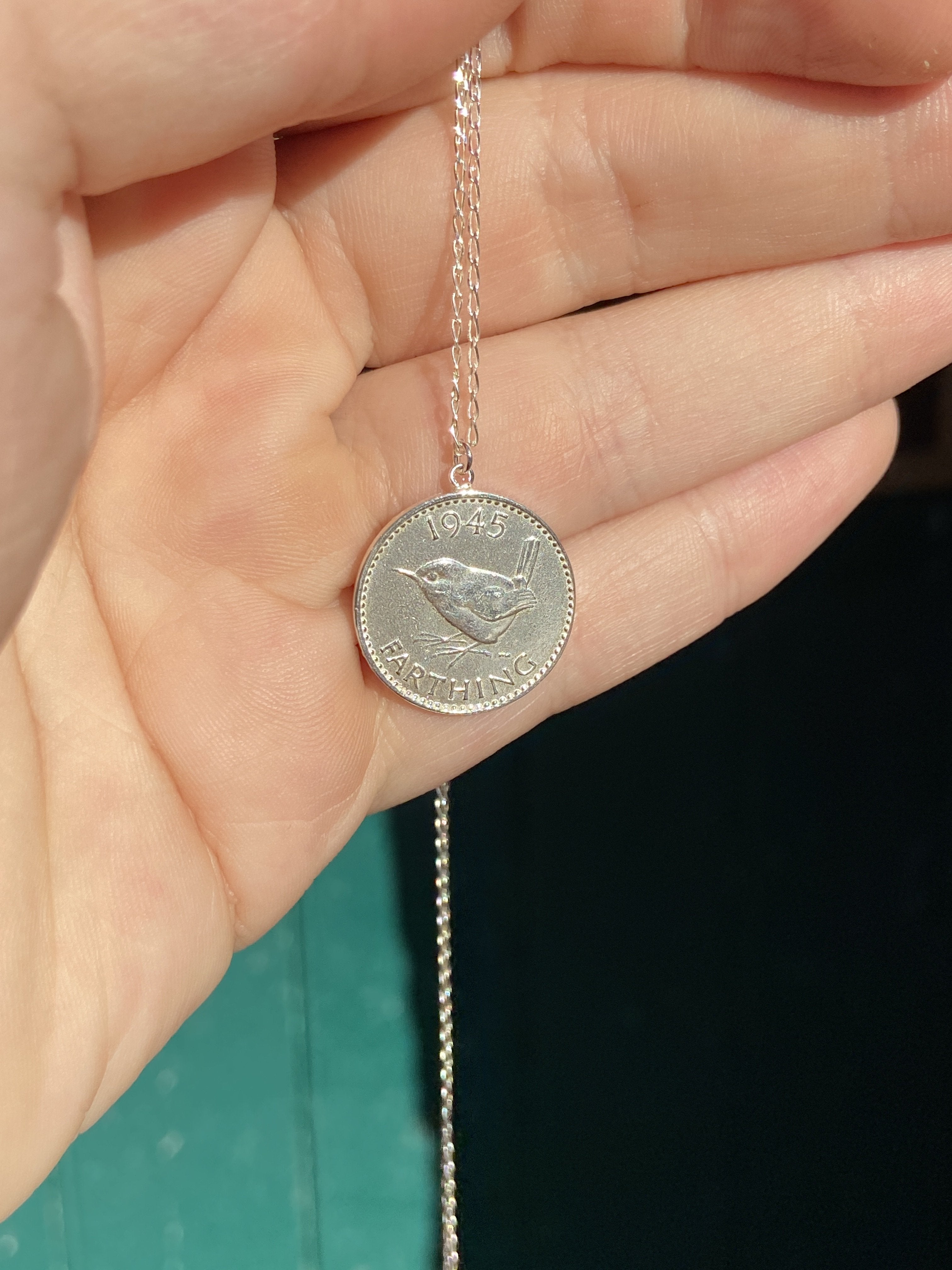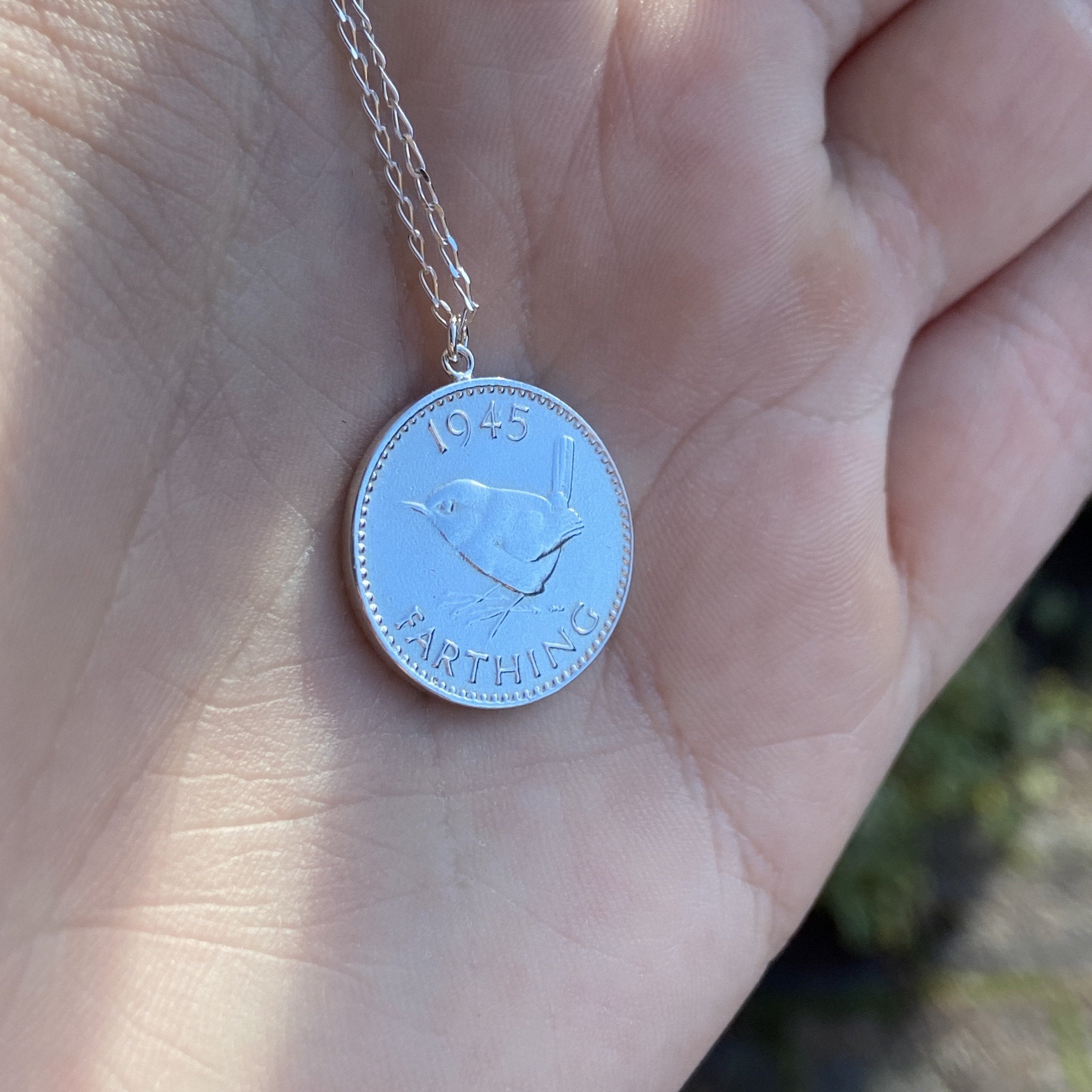 This beautiful hand made sterling silver pudding charm is cast from an original 1945 Farthing, and features a delightful Wren bird carving.