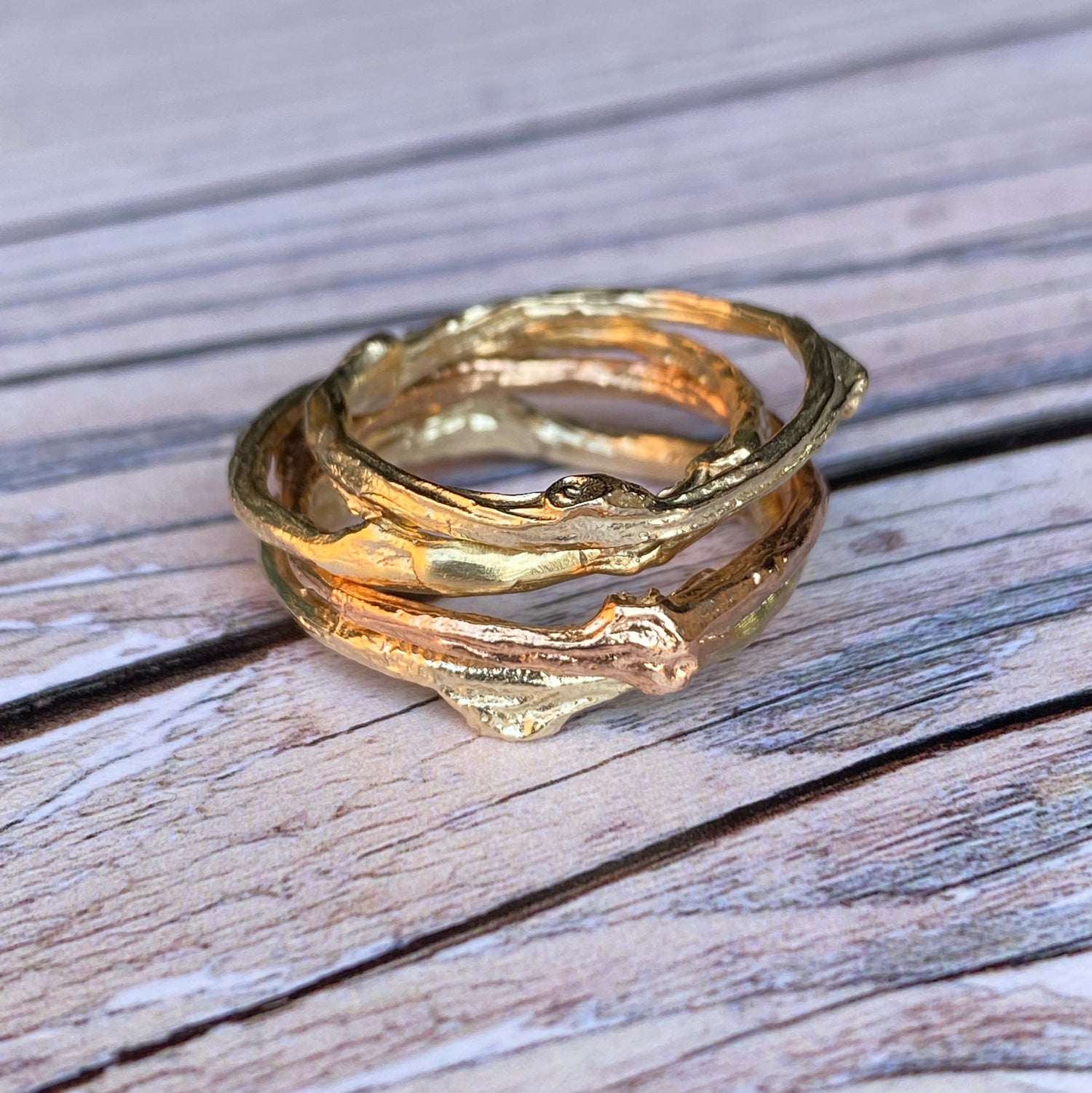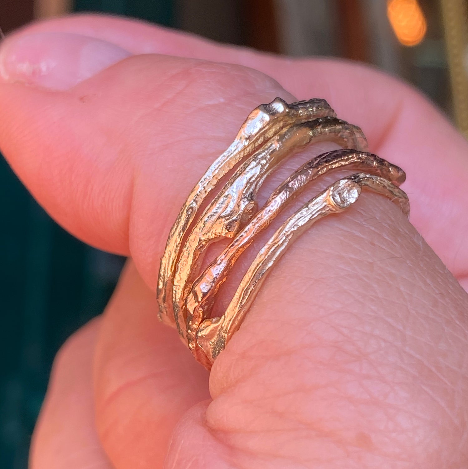 Here we have our lovely new addition to our twig range, stackable solid gold rose twig ring. Made from the same twig as our rose twig bangles, these rings would make a wonderful set along side our other bangles or our twig hoop earrings.